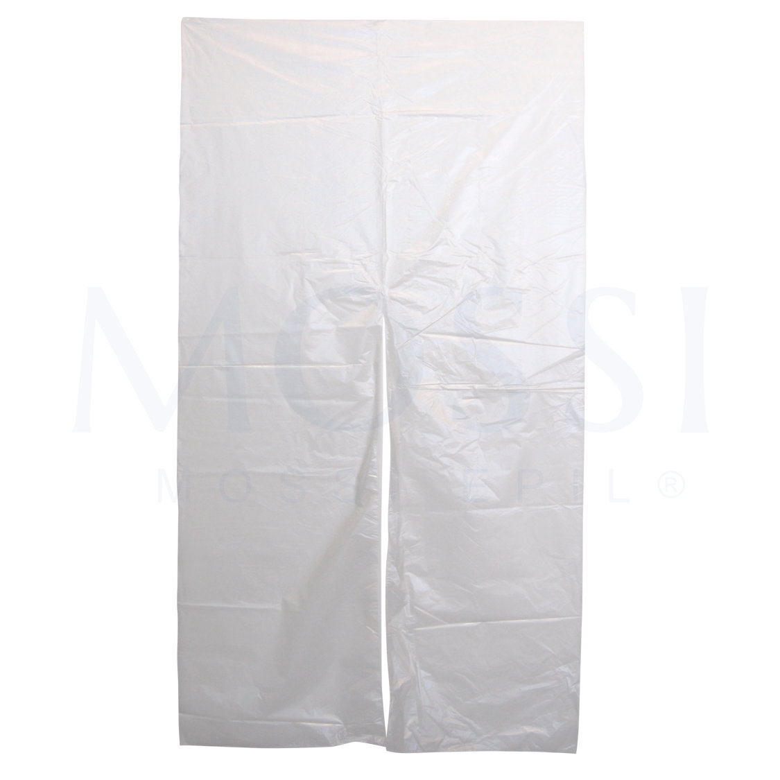 Calças de material PP, plastificadas são habitualmente colocadas no corpo antes de aplicar as bandas dum equipamento de pressoterapia ou mantas de sudação térmicas. Calças com 160cm de comprimento, 130cm medida do calcanhar à cintura. A cintura tem um diâmetro de 80cm. Não tem elástico na cintura. Para pessoas com estatura de maior volume. Mossi Epil.