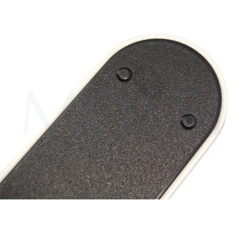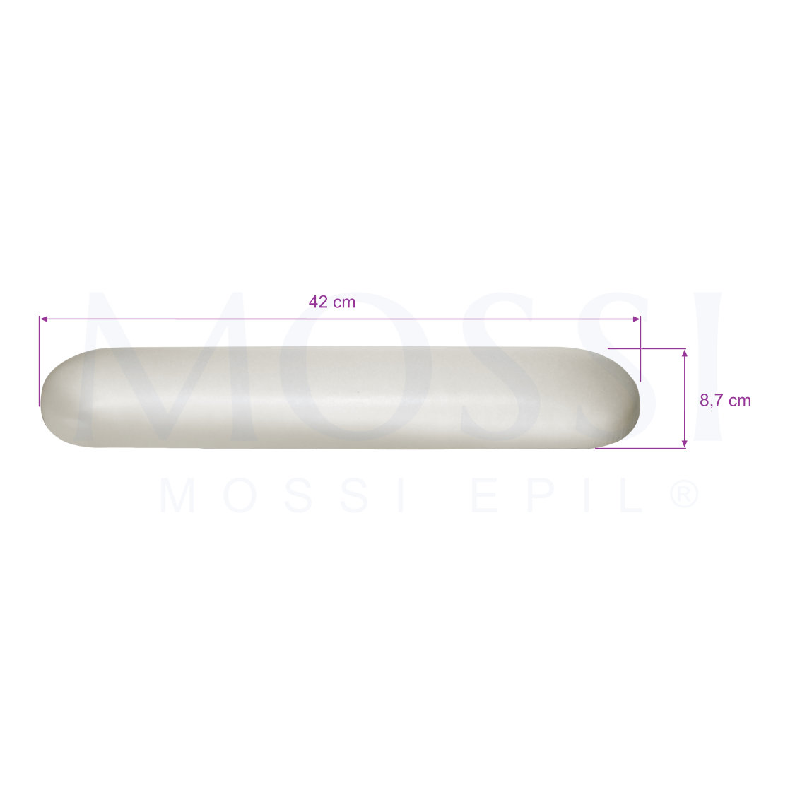 Almofada de apoio do antebraço, em napa branca de PVC para ser colocada em cima de mesa de manicure. Confere mais conforto e aumenta a elevação do antebraço do cliente, para que assim, a mão esteja numa altura melhor para a profissional poder efetuar o serviço de manicure. Comprimento 420mm x Largura 87mm. Mossi Epil.