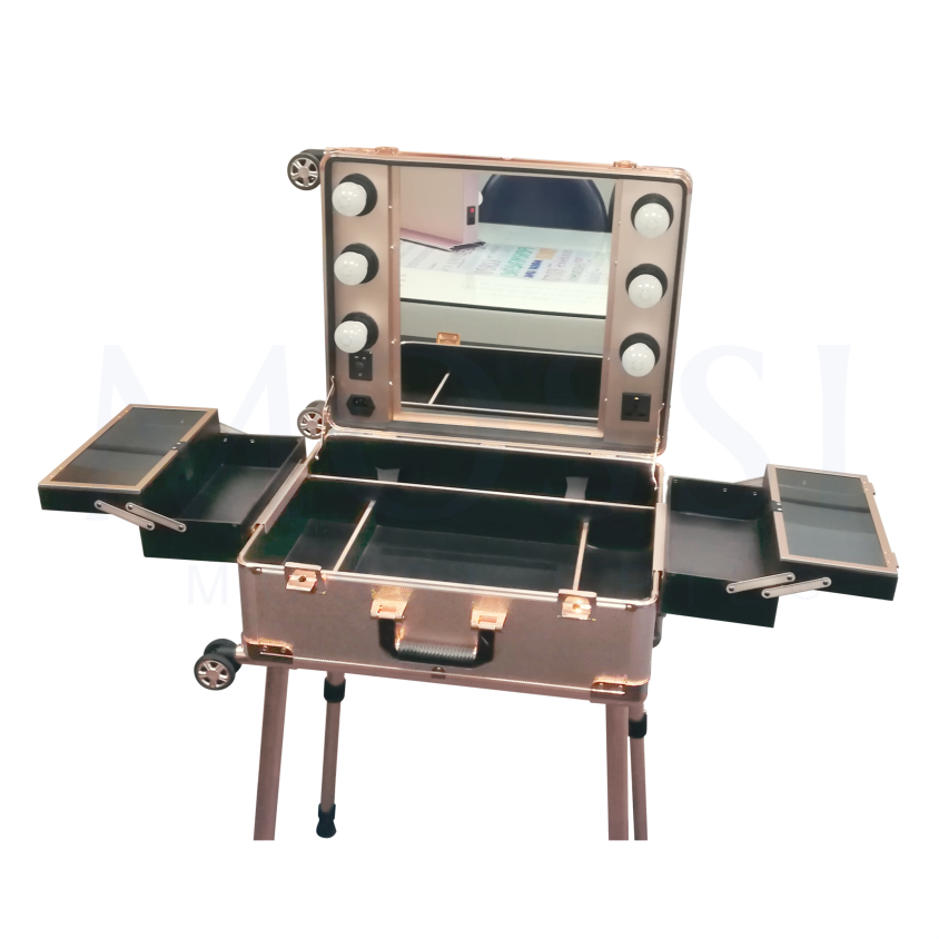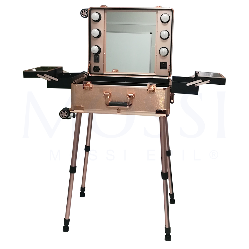 Rose gold aluminium case. This case can be assembled as a table and make-up mirror.