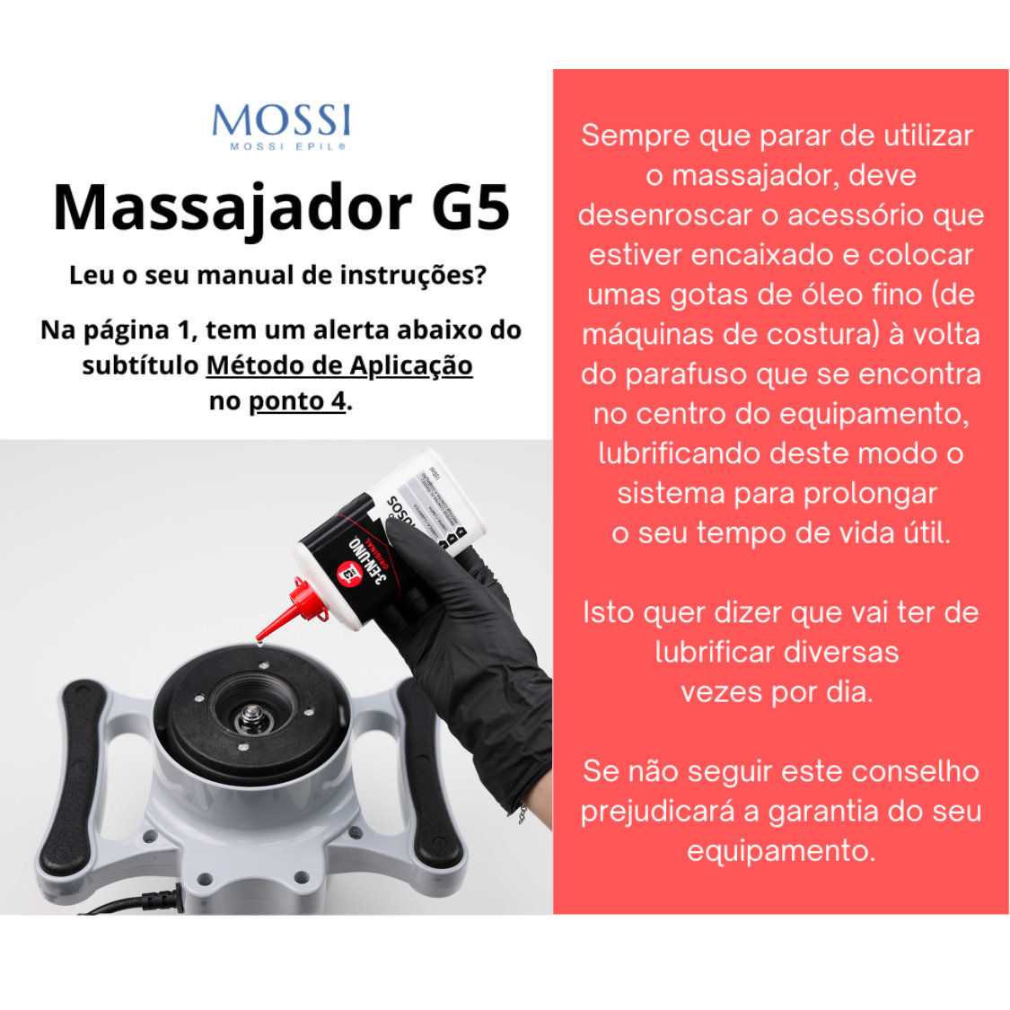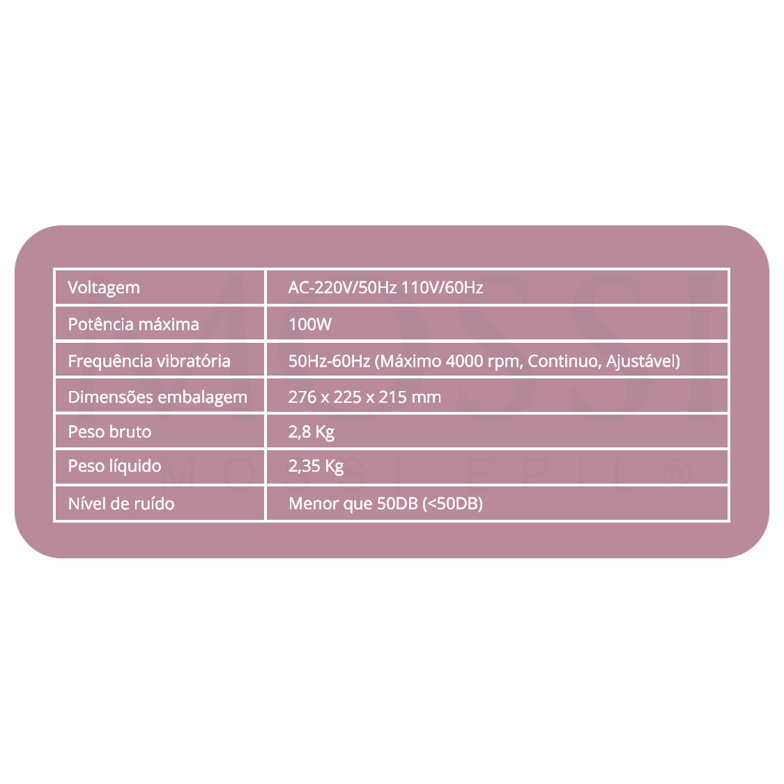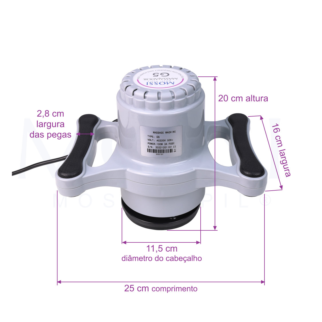 Derivado à sua função vibratória, ativa a circulação sanguinea e a regeneração de células da pele, colaborando com a firmeza da pele. O equipamento vem acompanhado com 3 acessórios para diferentes efeitos e contém um cabo elétrico de 2mt. Potência 100W. Consulte o manual de instruções em "+info". Mossi Epil.