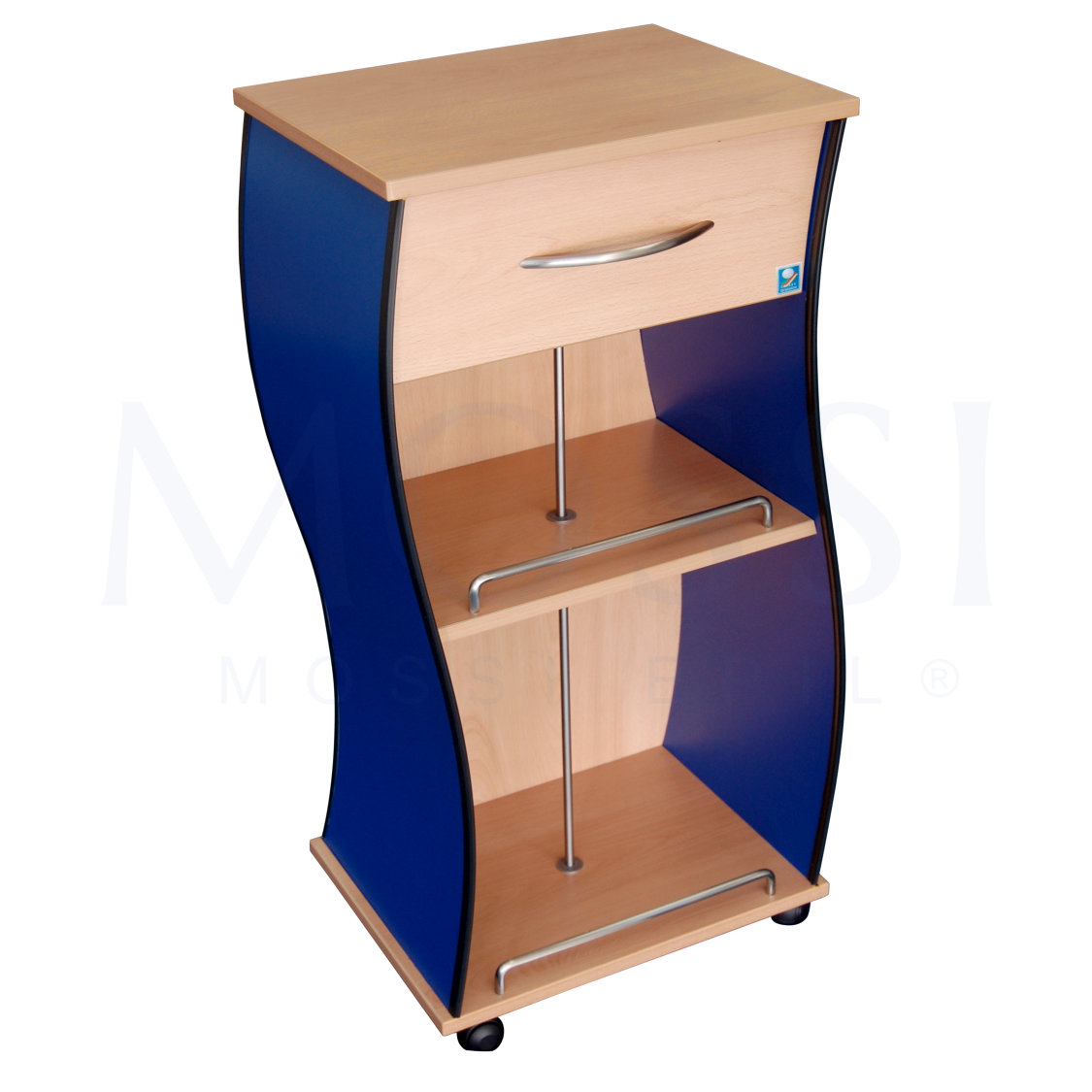 Mesa para apoio de aparatologia com gaveta e duas prateleiras. Design moderno e cor faia.