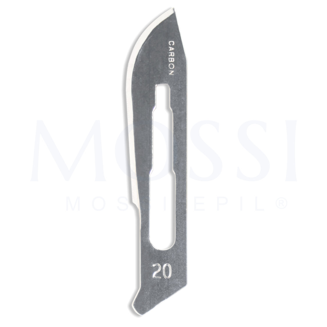 Lâmina de bisturi nº20 para cabo nº4. Lâminas descartáveis de uso único. Só para uso profissional com experiência. Mossi Epil.
