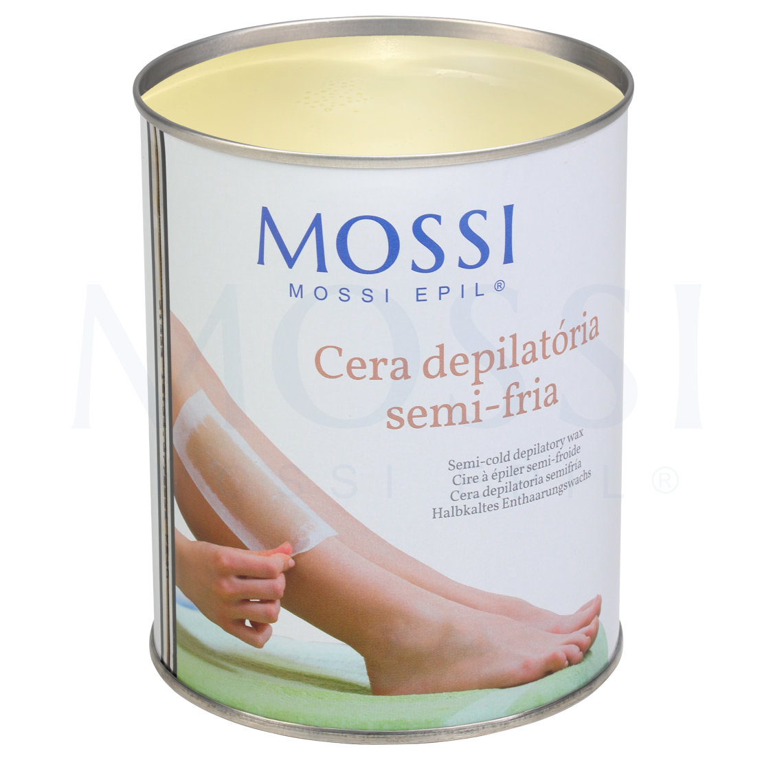 Cera depilatória textura intermédia - Ceras intermédias não secam rapidamente, sendo assim permite a profissional aplicar mais quantidade antes de remover a cera. As suas características fazem com que exista boa aderência ao pêlo. Ceras intermédias podem ser usadas tanto no Verão quanto no Inverno. Cera de lata faz que a epilação se torne mais económica derivado ao preço e facilita a profissional a aplicar a camada de cera conforme deseja. Cera depilatória Mossi Epil.