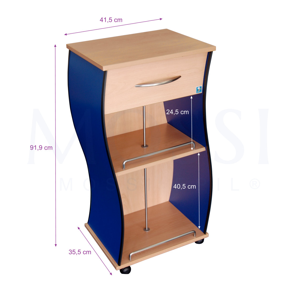 Mesa para apoio de aparatologia com gaveta e duas prateleiras. Design moderno e cor faia.