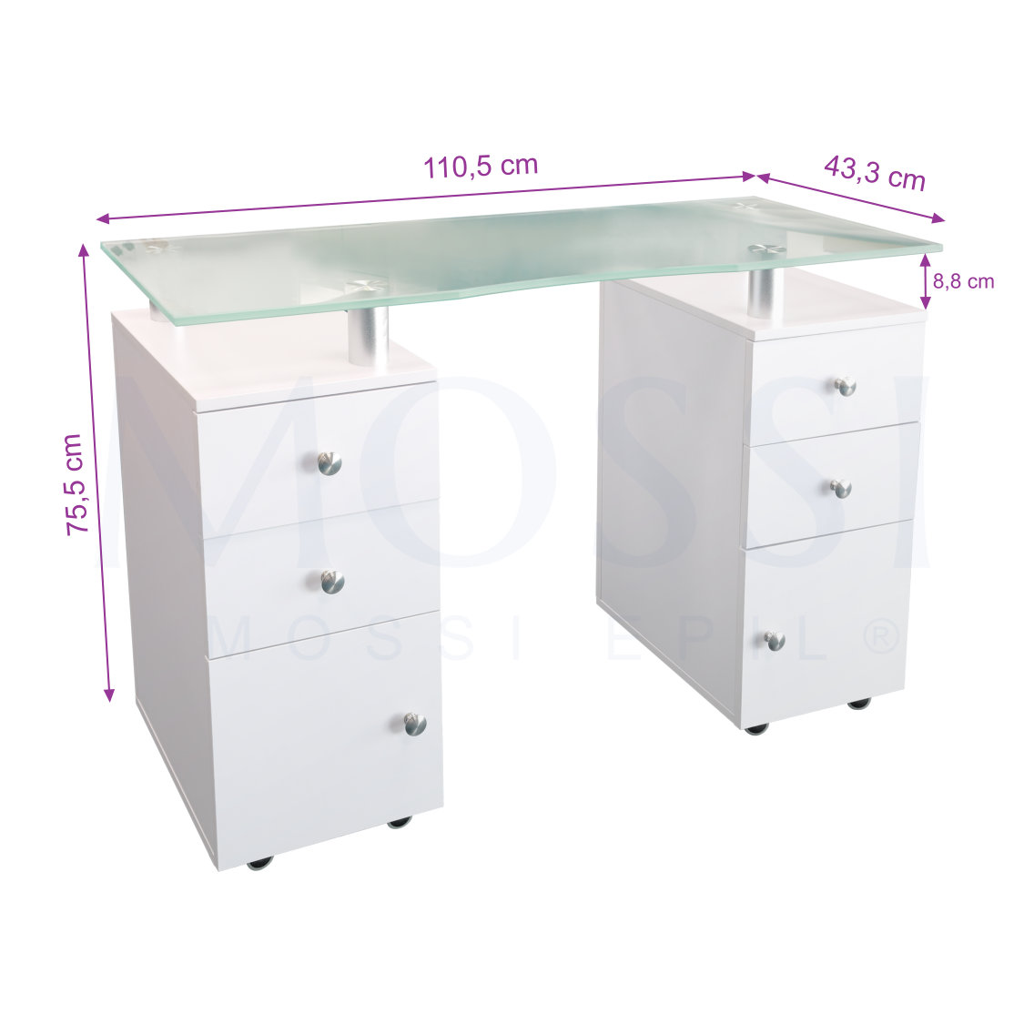 Mesa de manicure branca com móveis duplos, onde cada móvel tem 2 gavetas e uma porta para colocar embalagens de maior dimensão.