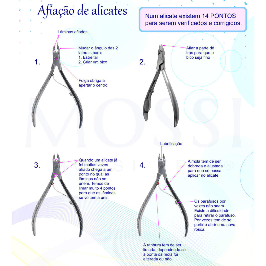Como o alicate é longo facilita o corte das unhas, evitando que a profissional faça muita pressão na mão, como acontece com um alicate curto.